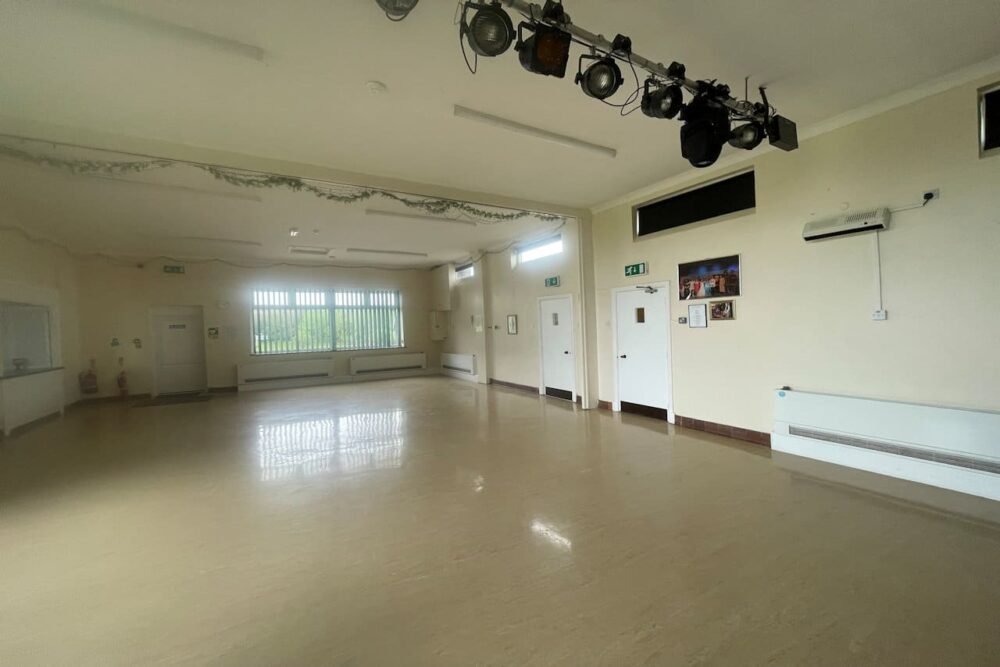 The large, well lit Village Centre hall is 16 metres long and 7.5 metres wide, with a maximum height of 3.4 metres except below the lighting bars, where it’s 2.6 metres.